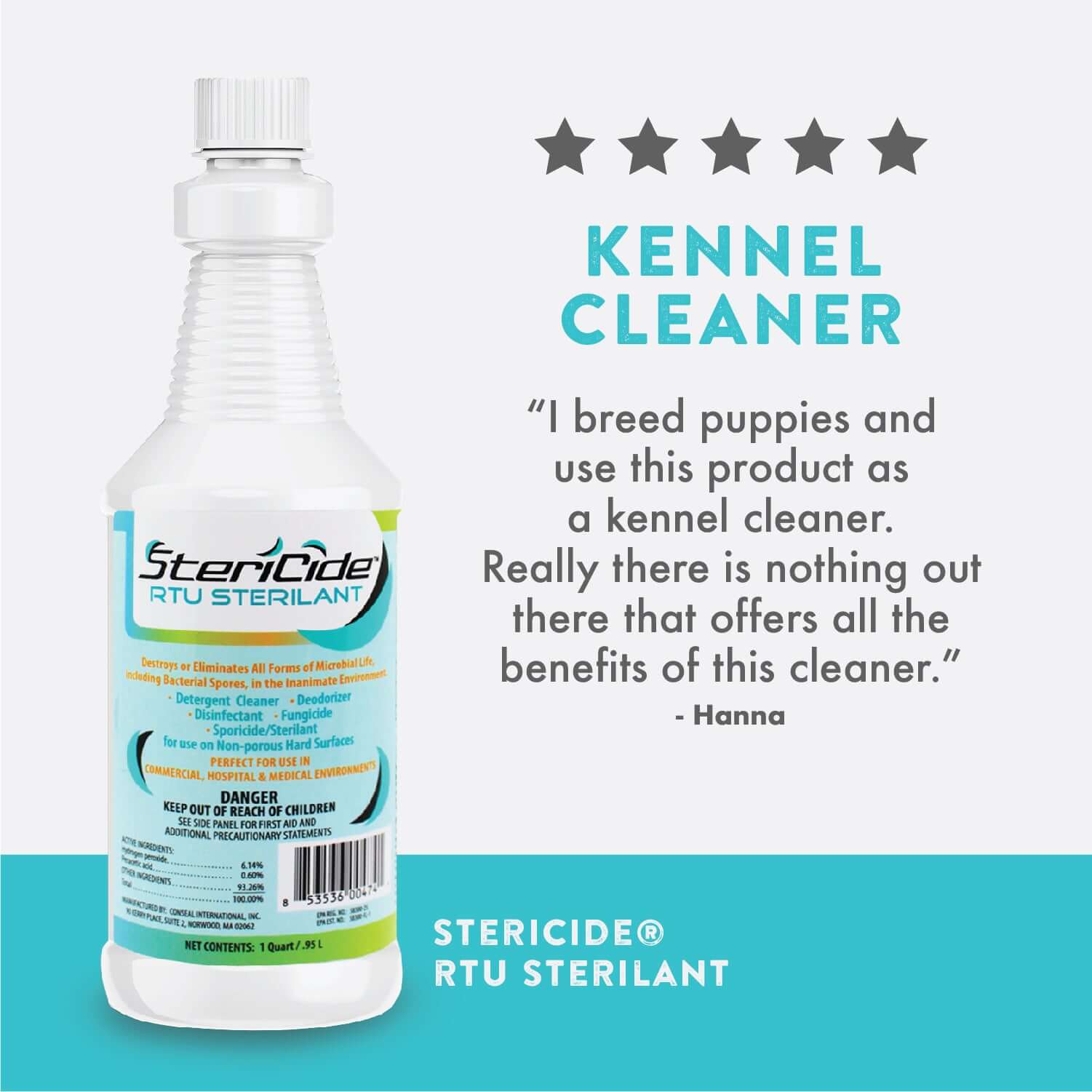 Detergent, cleaner, & deodorizer. Effective on surfaces in veterinary clinics, kennels, & grooming salons.